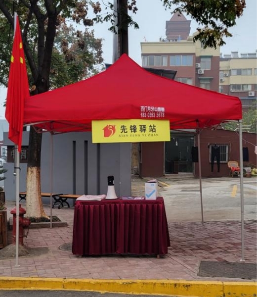 一頂紅帳篷,一個志愿者,一面黨旗,一張擺臺,一些紙筆,一摞防疫用品,這就是先鋒驛站。