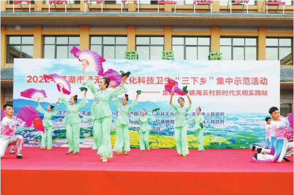 幸福的花鼓打起來(lái),精彩的戲曲聯(lián)唱和起來(lái),明快的歌伴舞表演跳起來(lái)、激奮人心的紅色故事講起來(lái)……在“三下鄉(xiāng)”活動(dòng)的舞臺(tái)上,由蕪湖市藝術(shù)劇院藝術(shù)團(tuán)、無(wú)為市委宣傳部等單位帶來(lái)的好節(jié)目輪番上演,大家伙看得目不轉(zhuǎn)睛、叫好連連。“這個(gè)京劇唱得地道,黃梅戲有韻味,廬劇表演爐火純青,比我在電視上看到的還要精彩呢!”62歲的村民陳大爺搖著蒲扇聽(tīng)著戲開(kāi)心地說(shuō)道。