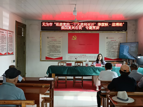 為迎接黨的二十大勝利召開,營造團結奮斗、自信自強“強國復興有我”的濃厚氛圍。2022年8月29日,無為市“迎接黨的二十大勝利召開‘舉旗幟·送理論’強國復興有我”專題宣講會在劉渡鎮慶豐村部新時代文明實踐站舉辦。無為市委黨校電教中心主任肖亞暉圍繞“以無悔奮斗書寫新時代華章”主題展開一場生動的宣講會。