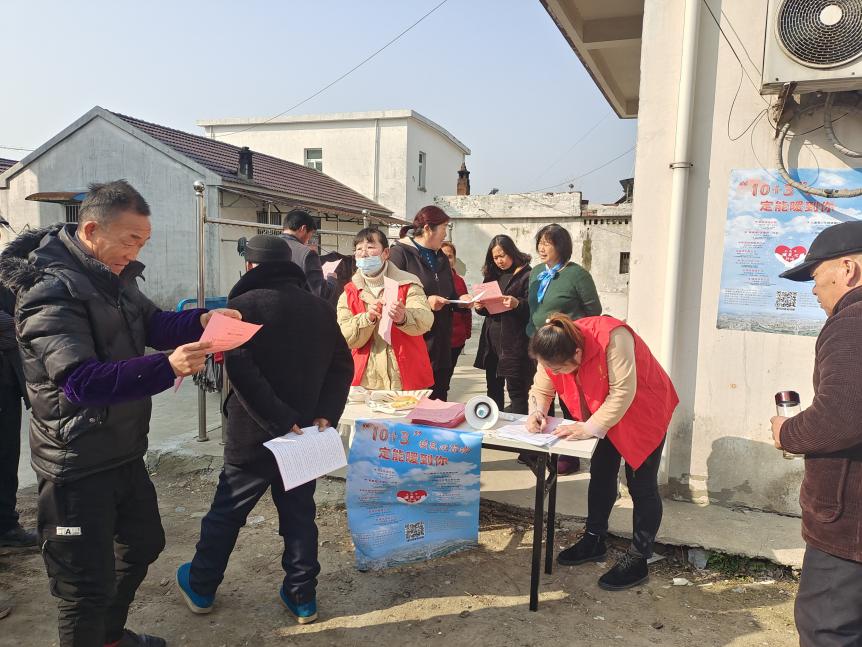鏡頭拉近,映入眼簾的是志愿者身穿紅色志愿服忙碌的身影和群眾拿著宣傳單頁仔細閱讀的神情。為提高“10+3”暖民心行動的知曉率,促進政策在基層落地生根,臨江村新時代文明實踐志愿者服務隊利用節假日走入村民家中,開展了一次干貨滿滿的主題宣傳活動。