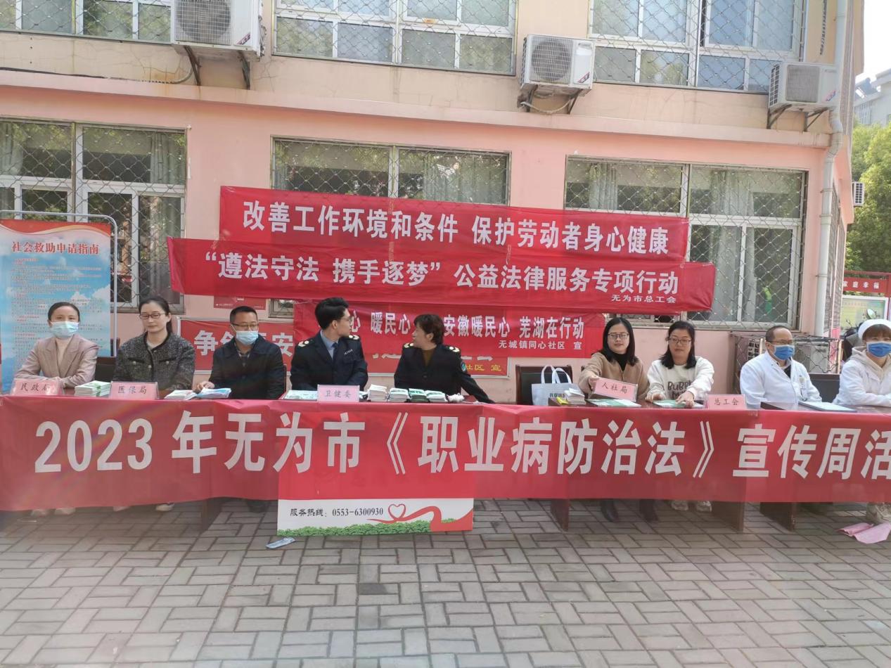 2023年4月25日至5月1日是第21個(gè)《職業(yè)病防治法》宣傳周,為深入宣傳貫徹《職業(yè)病防治法》,切實(shí)保障廣大勞動(dòng)者職業(yè)健康權(quán)益,4月26日上午,無為市衛(wèi)健、民政、人社、醫(yī)保、總工會(huì)等五部門前往同心社區(qū)開展了職業(yè)病防治知識(shí)進(jìn)社區(qū)宣傳活動(dòng)。