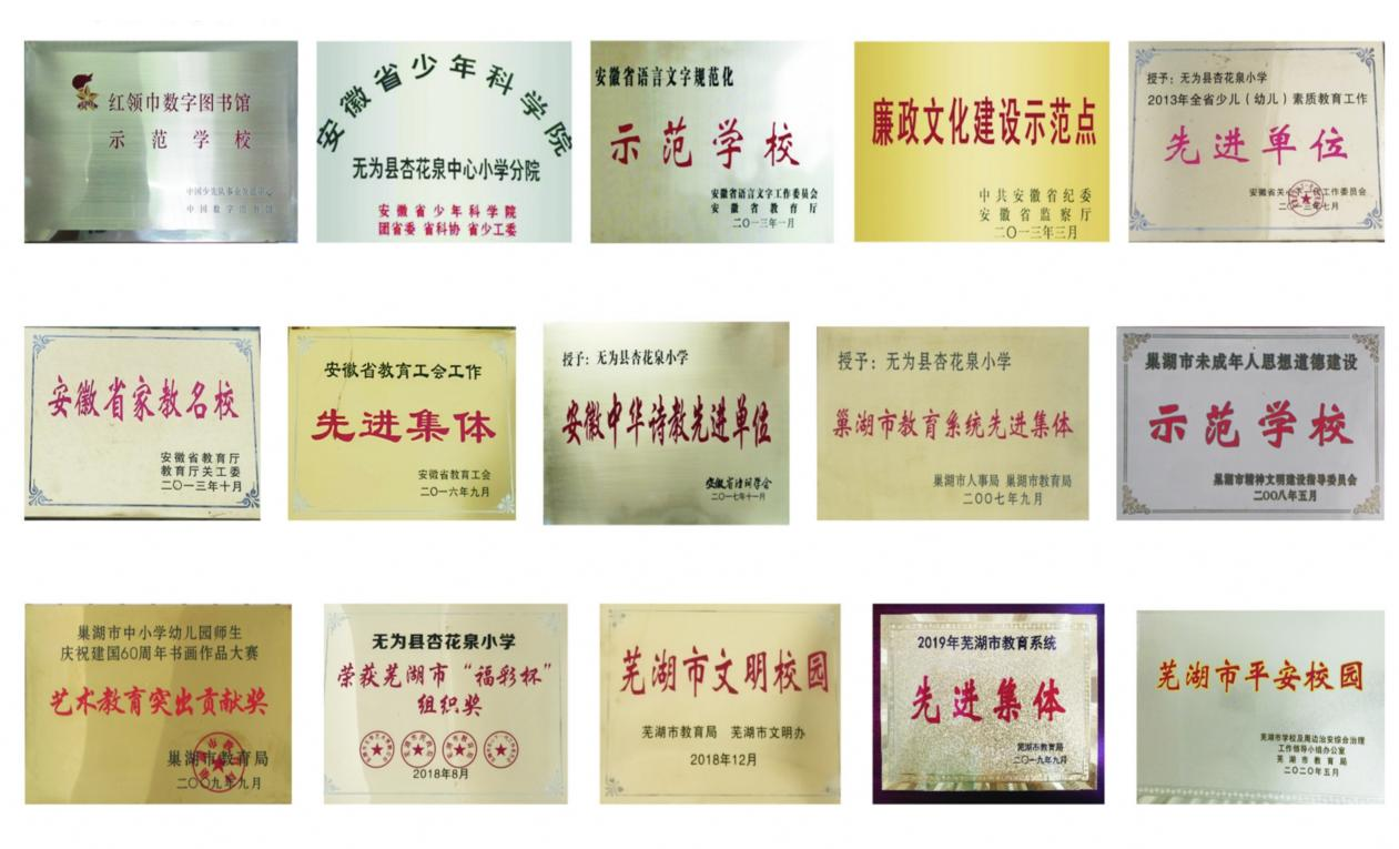春華秋實育英才,弦歌相傳樹風范,學校先后被命名為:安徽省未成年人思想道德示范校、安徽省語言文字規范化示范校、安徽省少年科學院三級分院、安徽省少幼兒智力開發教育先進單位、安徽省廉政文化進校園示范點、安徽省家教名校、安徽省教育工會工作先進集體、安徽省中華詩教先進單位等。