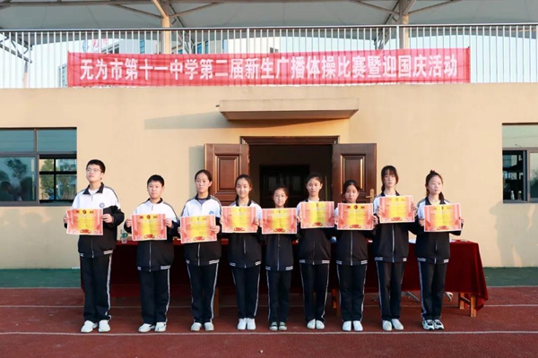 我運動,我健康,我快樂。為增強學生身體素質,豐富校園文化生活,提高學子廣播體操動作質量,倡導全民健康運動,引導廣大青少年積極參與到集體運動中,展示校園素質教育成果,無為市第十一中學結合祖國72歲華誕,日前在校園運動場隆重舉行七年級新生廣播體操比賽活動。該校9個班級的七年級新生愉快地參加了此次活動。
