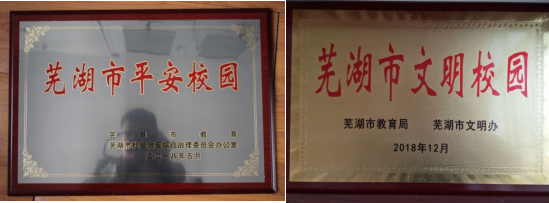 綜合治理到位,校園和諧平安。依章依規強化校園環境綜合治理,積極配合鎮政府、派出所、工商所、食品藥品監督局等對學校及周邊環境進行整治,凈化了校園環境。每年,學校均邀請律師事務所或司法所或派出所等專業人員來校作法制教育、毒品預防教育和防范校園欺凌教育等,不斷增強師生守法用法的觀念。2018年無為縣第一屆文明校園稱號;2018年蕪湖市文明校園稱號;2018年蕪湖市平安校園; 2019年無為市第二屆文明校園稱號;2019年蕪湖市毒品預防工作示范學校;202019年榮獲全國文明校園先進學校稱號;2020年無為市第三屆文明校園。