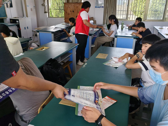 志愿者向學生群體發放民族團結進步宣傳畫冊