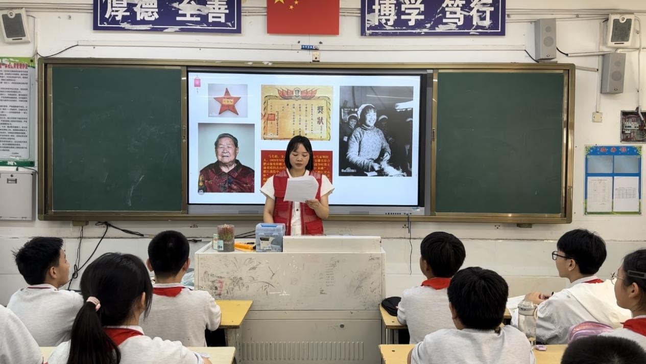 活動中,志愿者給同學們講述了“七一勛章”獲得者、“渡江英雄”、無為人身邊的英雄馬毛姐的光榮歷史。她手臂中彈,依然咬牙堅持,6次橫渡長江,以“一手掌舵,一手劃槳”為渡江大軍順利靠岸立了頭功。馬毛姐的事跡向同學們生動地詮釋了共產黨人不怕犧牲、淡泊名利、甘于奉獻的高尚品格,踐行了“一生獻給黨與人民”的錚錚誓言。最后,四中的同學給大家?guī)碓娎收b《我的祖國》,表現(xiàn)出自己強烈的愛國之情。